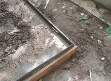 Укрепляем по периметру участка металлические планки, которые будут границей и дополнительной опорой брусчатке, свариваем их между собой и смачиваем пескобетон.