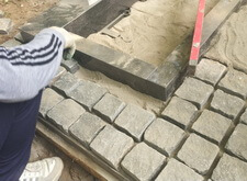 Засыпаем брусчатку пескобетоном, снимаем лишний слой, замываем.