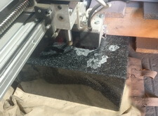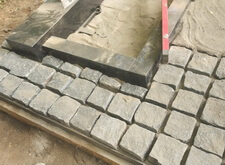 Начинаем укладывать брусчатку, параллельно монтируя цветник из гранитных балок. Кое-где целые квадратики не помещались, поэтому нам приходилось распиливать