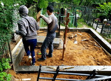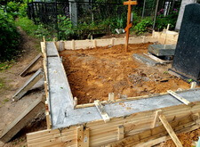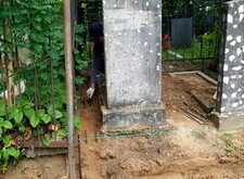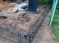 Вкопанные ранее сваи послужили великолепной основой для металлического каркаса, который мы и сварили прямо на территории места захоронения. Каркас был установлен по периметру участка с целью придать дополнительную жёсткость опалубке.