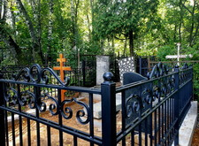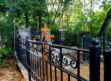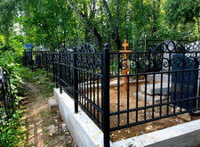 Затем наступил самый ответственный этап работы: монтаж ограждение. Работа по его установке опять-таки заняла достаточно долгое время, однако в результате чего по периметру могилы была установлена достаточно высокая статусная металлическая ограда, сразу же выделяющая место захоронения на фоне других участков. На фотографиях ниже представлен окончательный внешний вид могилы с разных ракурсов на момент завершения работ.