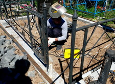 Тем временем опалубка окончательно высохла, и у нас появилась возможность вернуться к периметру участка. Отмерив брусчаткой точную ширину линии, мы приварили к уже существующему металлическому каркасу внутренние элементы.