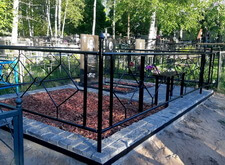 Дождавшись, пока покрытие высохнет, мы приступили к последней фазе работы. В цветники и специальную нишу, которую по желанию клиента не стали закладывать брусчаткой, засыпали мульчу. После этого протёрли памятники и ограждение. Могила готова, заказчик остался нами доволен.