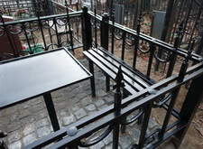 Пришло время окончательной отделки: мы затерли все швы герметиком, протерли плиты от следов цемента, помыли ограду, лавочку и столик, прикрыли землю в цветнике. Место захоронения готово к сдаче заказчику.