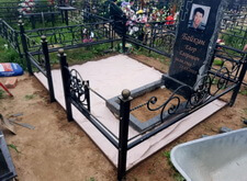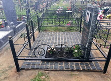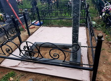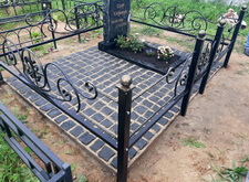 Брусчатку замываем водой: пескобетон размокает, превращаясь в надёжный скрепляющий раствор. На этом наши работы на могиле закончены, клиент выразил благодарность за оперативность и качество оказанных услуг.
