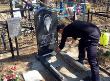 Клиентка обратилась к нам с просьбой восстановить покосившийся от времени памятник. Приехав на участок, мы обнаружили простенькое гранитное надгробье, немного завалившееся и просевшее от времени. После необходимых разъяснений мы, совместно с заказчицей, утвердили проект восстановления и принялись за работу.